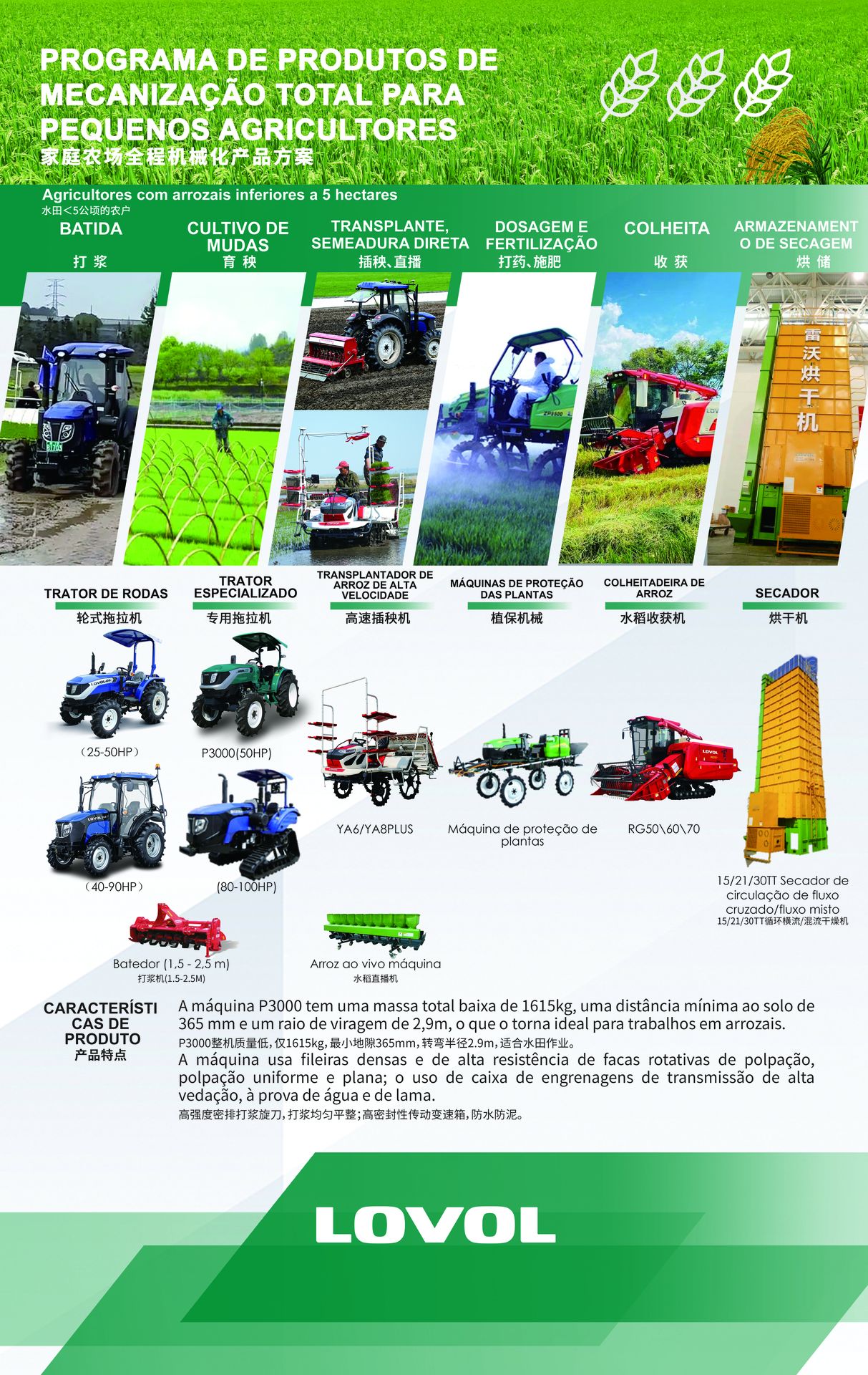 A lovol Solução Integrada para Campos de Arrozais foi desenvolvida para atender às condições específicas dos arrozais sul-americanos, combinando tecnologia avançada, alta eficiência e excelente adaptabilidade ao terreno alagado. Os tratores e colheitadeiras lovol contam com motores potentes e econômicos, sistemas de tração reforçados e excelente estabilidade, garantindo operações confiáveis mesmo em solos úmidos e irregulares. Além disso, a lovol oferece um pacote completo que integra preparo do solo, plantio, manejo e colheita, ajudando os produtores da América do Sul a aumentar a produtividade, reduzir custos operacionais e alcançar uma agricultura de arroz mais sustentável e rentável.
