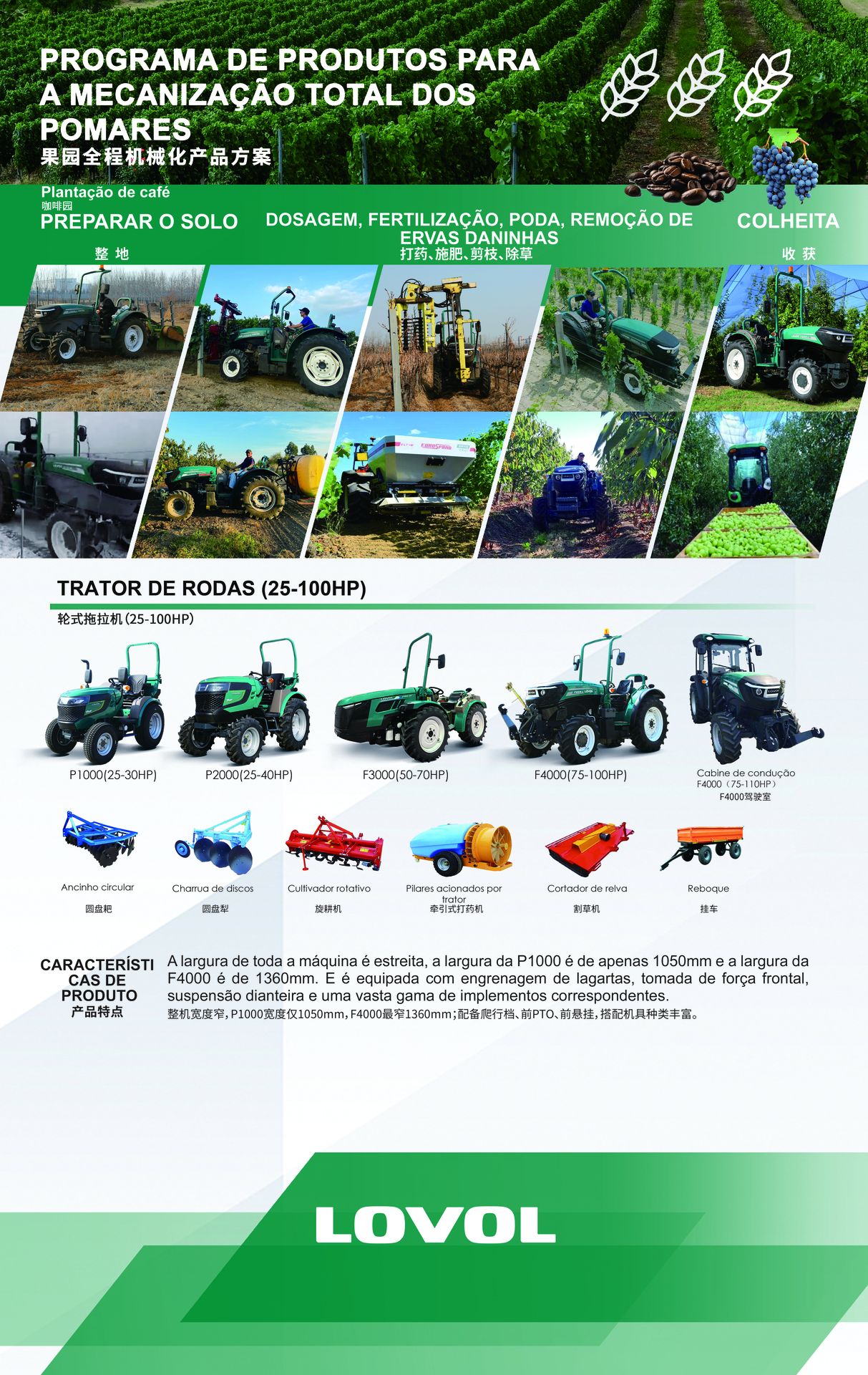 A Solução Integrada para Plantação de Café Lovol foi especialmente desenvolvida para atender às necessidades dos cafeicultores da América do Sul, unindo robustez, precisão e eficiência operacional. Os tratores Lovol oferecem excelente manobrabilidade em terrenos montanhosos e entrelinhas estreitas, além de motores potentes e econômicos que garantem desempenho constante durante todo o ciclo produtivo do café. Com equipamentos adaptados para preparo do solo, plantio, pulverização e transporte, a Lovol proporciona uma solução completa que aumenta a produtividade, reduz o esforço operacional e contribui para uma cafeicultura mais sustentável e competitiva no mercado sul-americano.